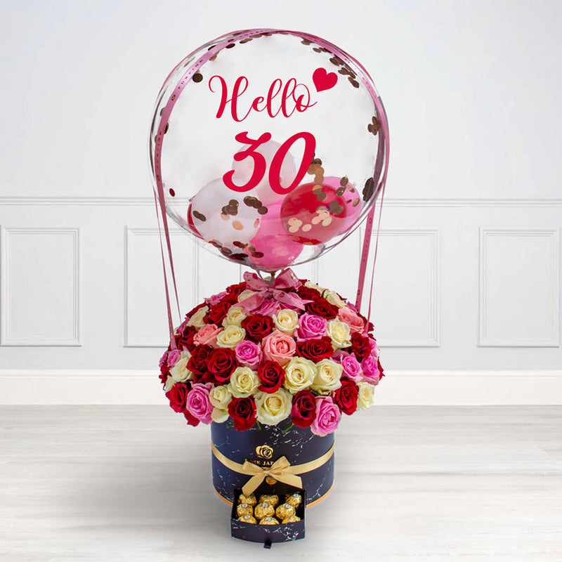 Express your love in the most enchanting way with the Personalised Mixed Roses & Kisses Hot Air Balloon. This breathtaking arrangement is perfect for romantic surprises, whether it's for an anniversary, birthday, proposal, or just to remind her how much she means to you.