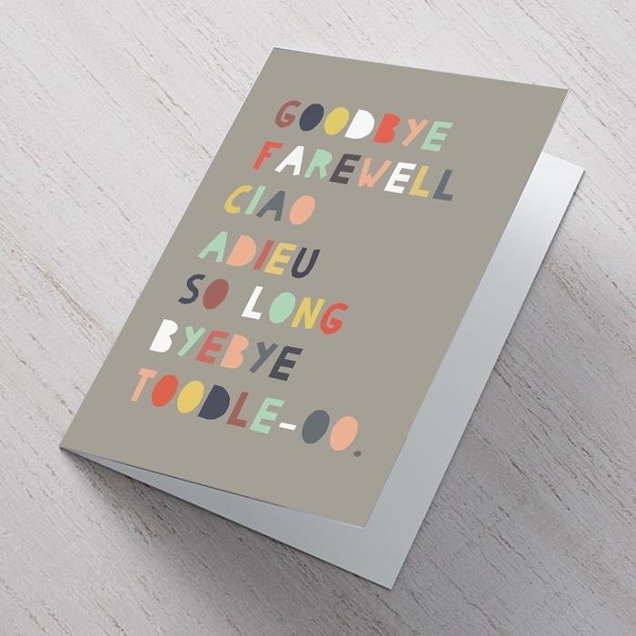 This is an A6 folded card with the "Goodbye farewell ciao adieu so long bye bye tooddl-oo' embroidery.