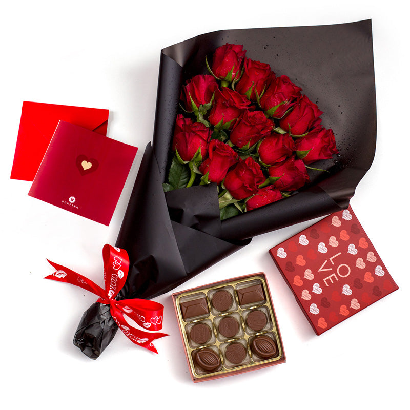 Whether it’s for an anniversary, Valentine’s Day, or just to say “I love you,” this bouquet and chocolate duo is the ultimate gesture of love and romance.