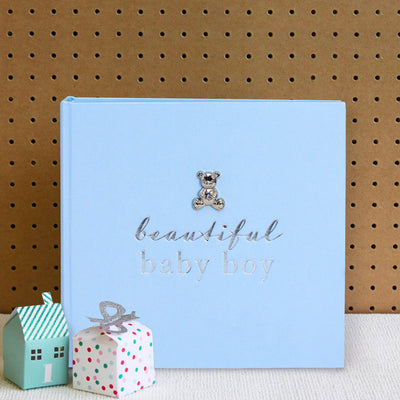 The photo album holds 80 4" x 6" photographs and is embellished with crystal finished pram, teddy bear and rocking horse icons.