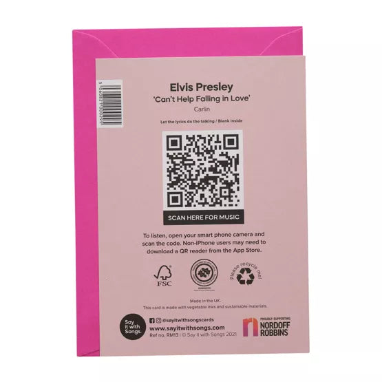 This unique music card plays the classic song ‘Can’t help falling in love’ by Elvis Presley. Scan the QR code on the reverse of the card with a smartphone camera and stream the song instantly from either Spotify, YouTube or Amazon Music. It’s the card they’ll keep forever.