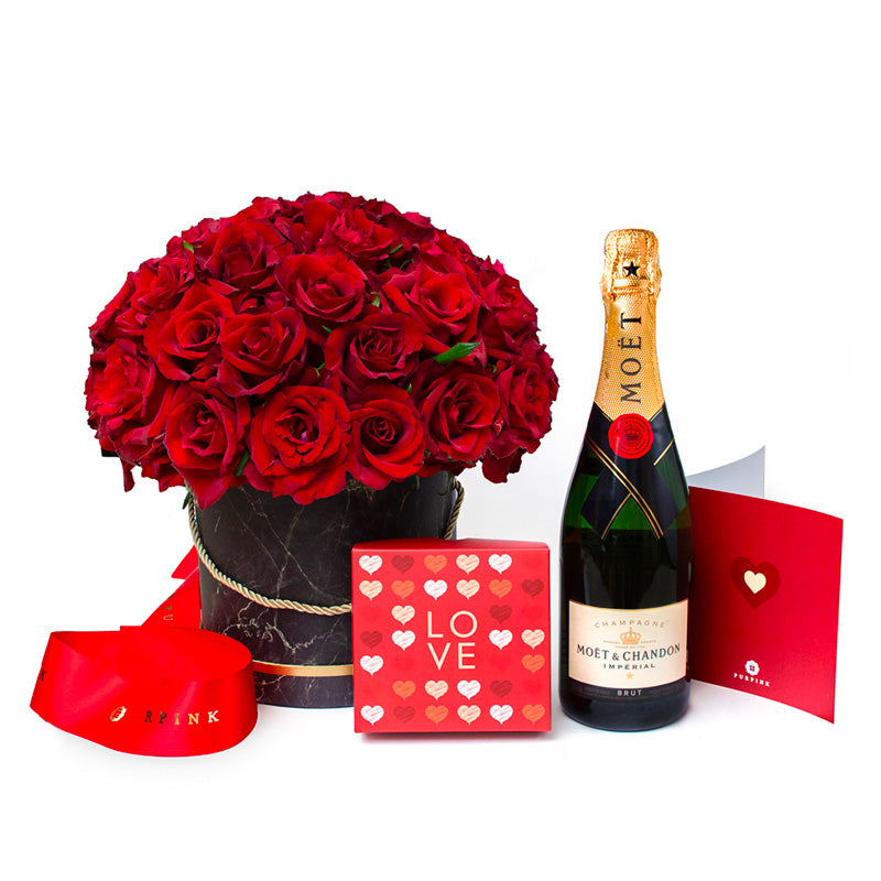 Make their day unforgettable with a luxurious trio of Moët & Chandon Impérial Brut, a hatbox of premium red roses, and Van Roy Belgian chocolates—finished with a heartfelt card. Perfect for anniversaries, proposals, birthdays, or simply saying I love you.