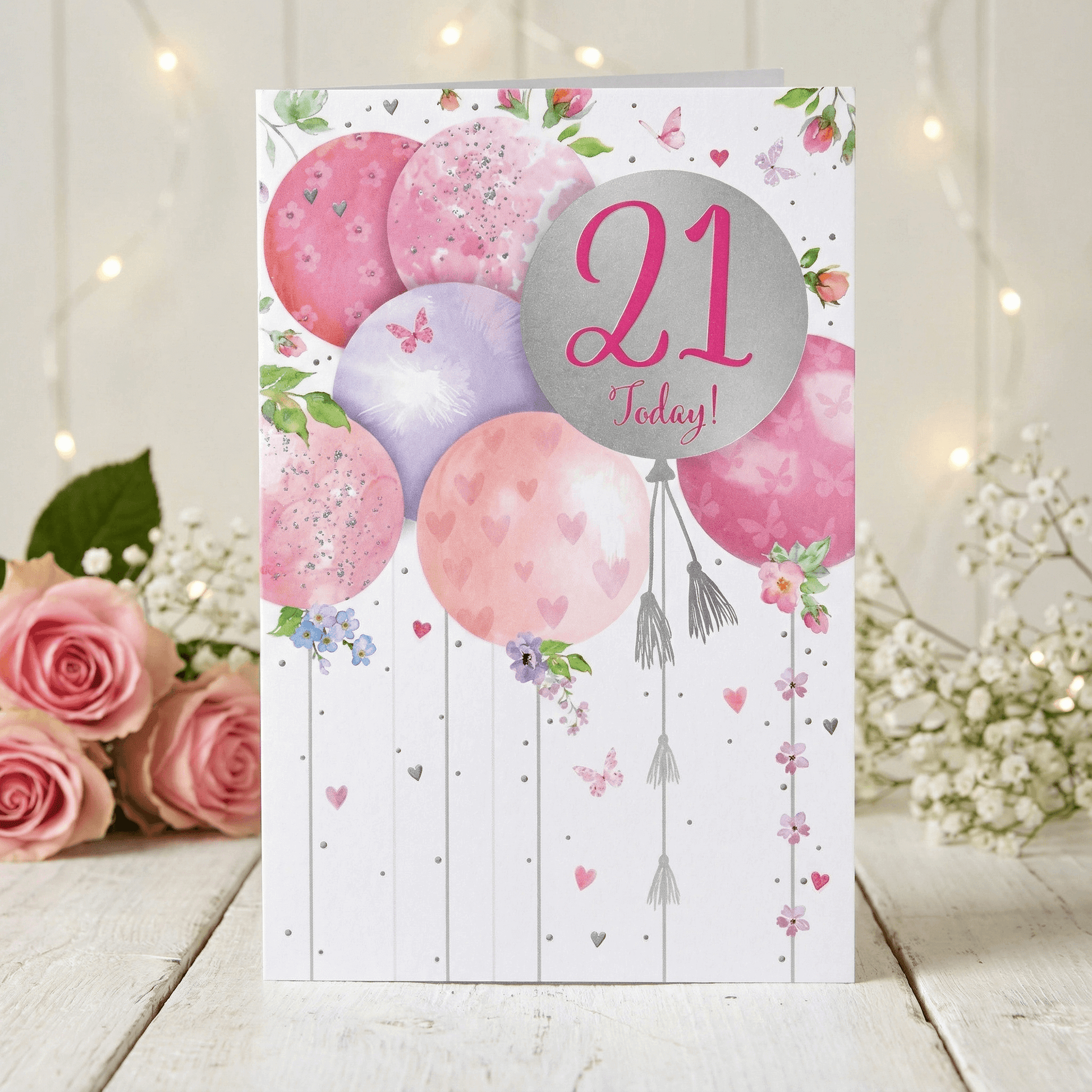 Celebrate her milestone moment with this beautifully designed 21st celebration card, featuring a dreamy cluster of pink, lilac, and blush balloons surrounded by delicate florals, butterflies, and soft glitter-style detailing.