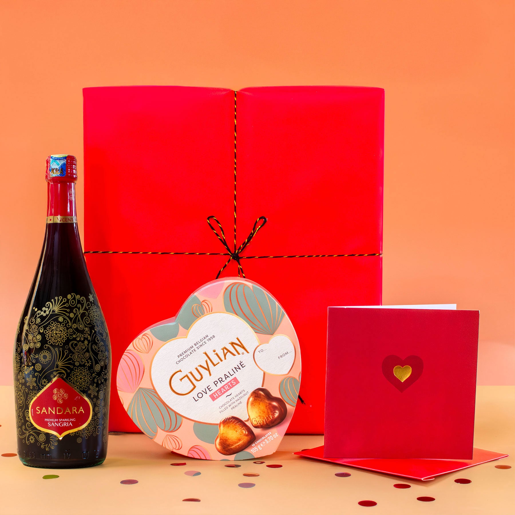 At the heart of this hamper is a box of Guylian Love Praliné Hearts — indulgent Belgian chocolates crafted with smooth hazelnut praliné and rich chocolate, shaped perfectly for sharing. Paired with this is your choice of a celebratory drink: either the Sandara Sparkling Sangria, light and festive with a gentle sparkle, or the decadent Rosso Nobile al Cioccolata Red Wine, infused with indulgent chocolate notes for a truly romantic twist.