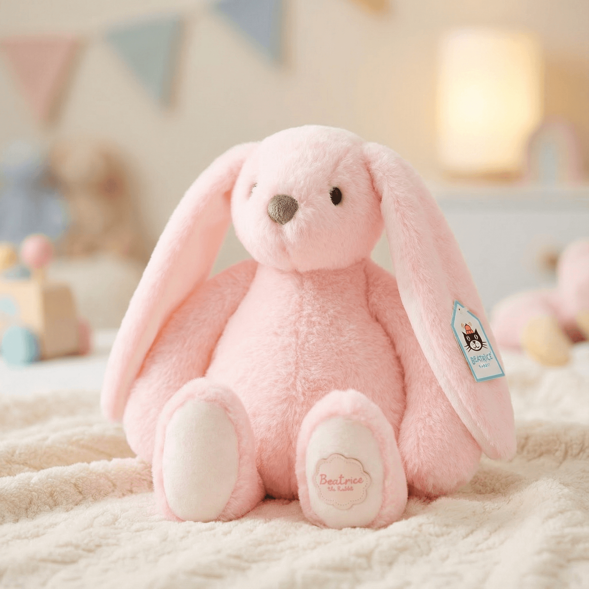 Meet Beatrice the Bunny — the softest, sweetest companion for little ones and a beautiful keepsake for any nursery. Made in a gentle blush-pink plush with extra-long floppy ears, Beatrice is designed to give comforting cuddles and timeless charm.
