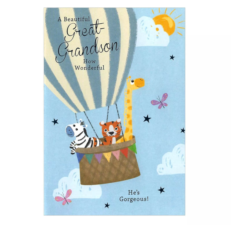Celebrate the arrival of a newborn baby boy with this gentle and whimsical card featuring a charming hot air balloon scene.