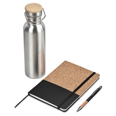 A stylish eco-conscious gift set featuring a stainless steel water bottle with bamboo lid, a cork-detailed notebook, and a cork-grip pen. Perfect for clients, staff, or onboarding, all neatly packed in a natural kraft gift box.