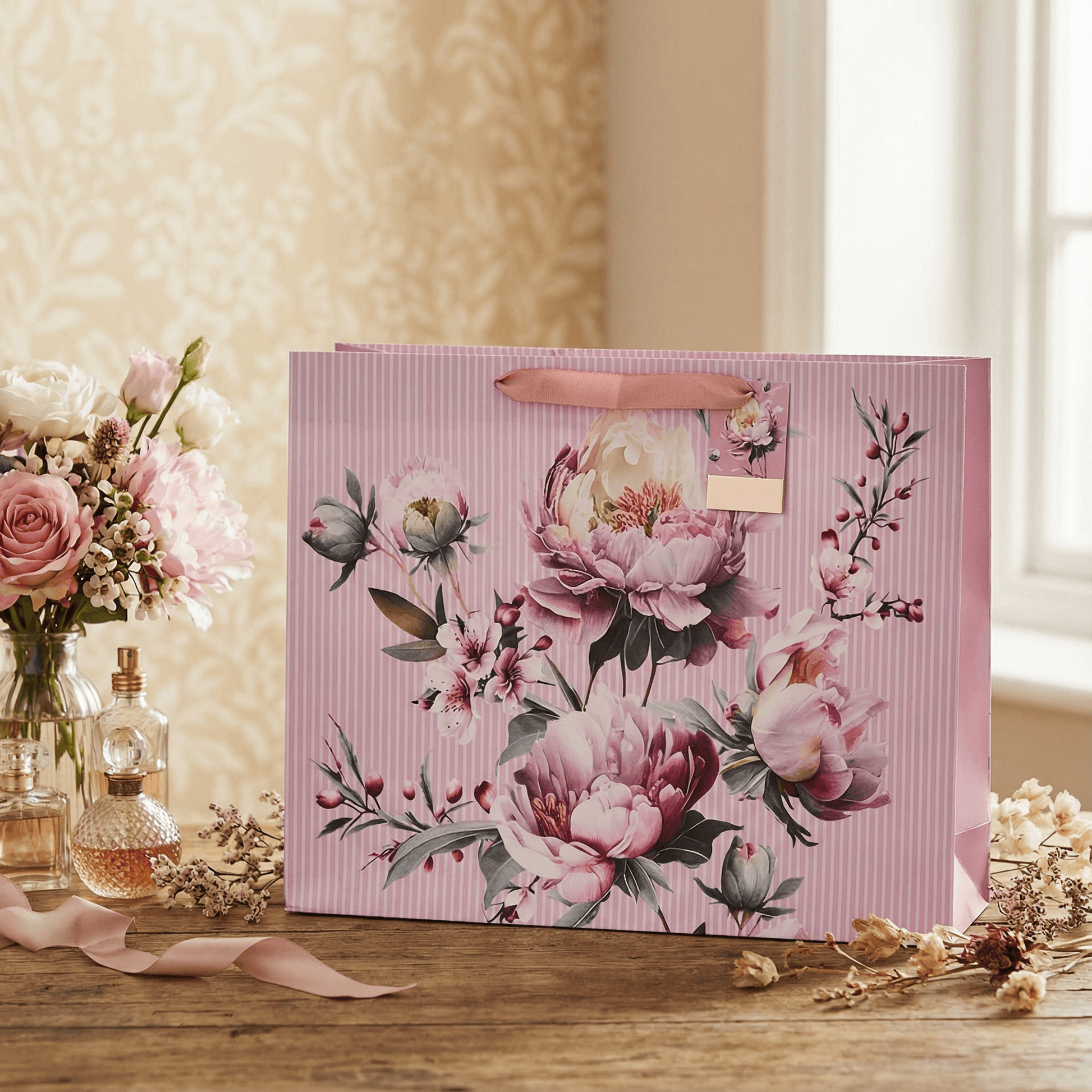 Featuring lush peonies and delicate blossoms in dreamy shades of blush and mauve, this bag brings a luxurious, feminine touch to your presentation. The subtle pinstripe background adds a refined finish, while the satin ribbon handle and matching floral gift tag complete the look with effortless charm.