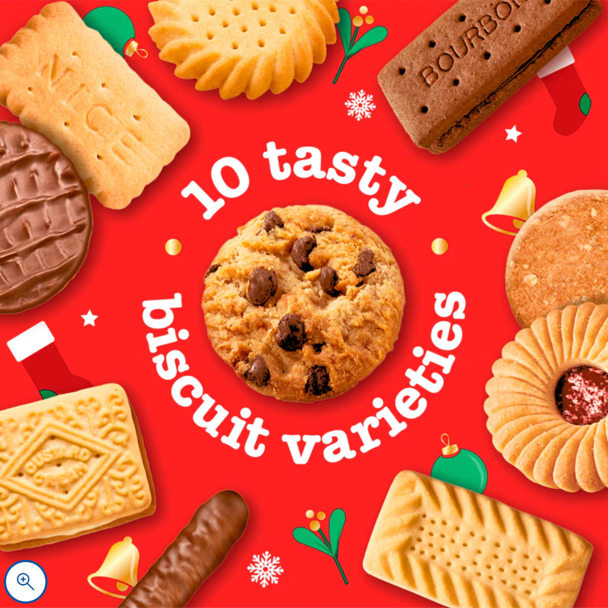 10 biscuit varieties: Highland Shorties, Milk Chocolate Digestives, Custard Creams, Choc Chip Cookies, Shortcake, Jam Sandwich Creams, Milk Chocolate Fingers, Crunchy Oat, Nice, Bourbon Creams