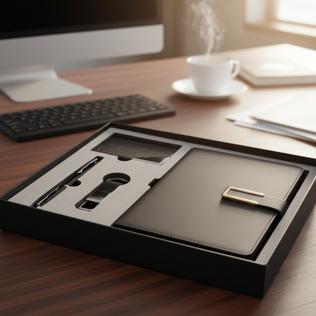 The Notebook Gift Set is a stylish and practical collection perfect for corporate gifting or everyday use. It includes an A5 hardcover notebook, metal pen, card holder, and keychain, all neatly packaged in a gift box and bag.
