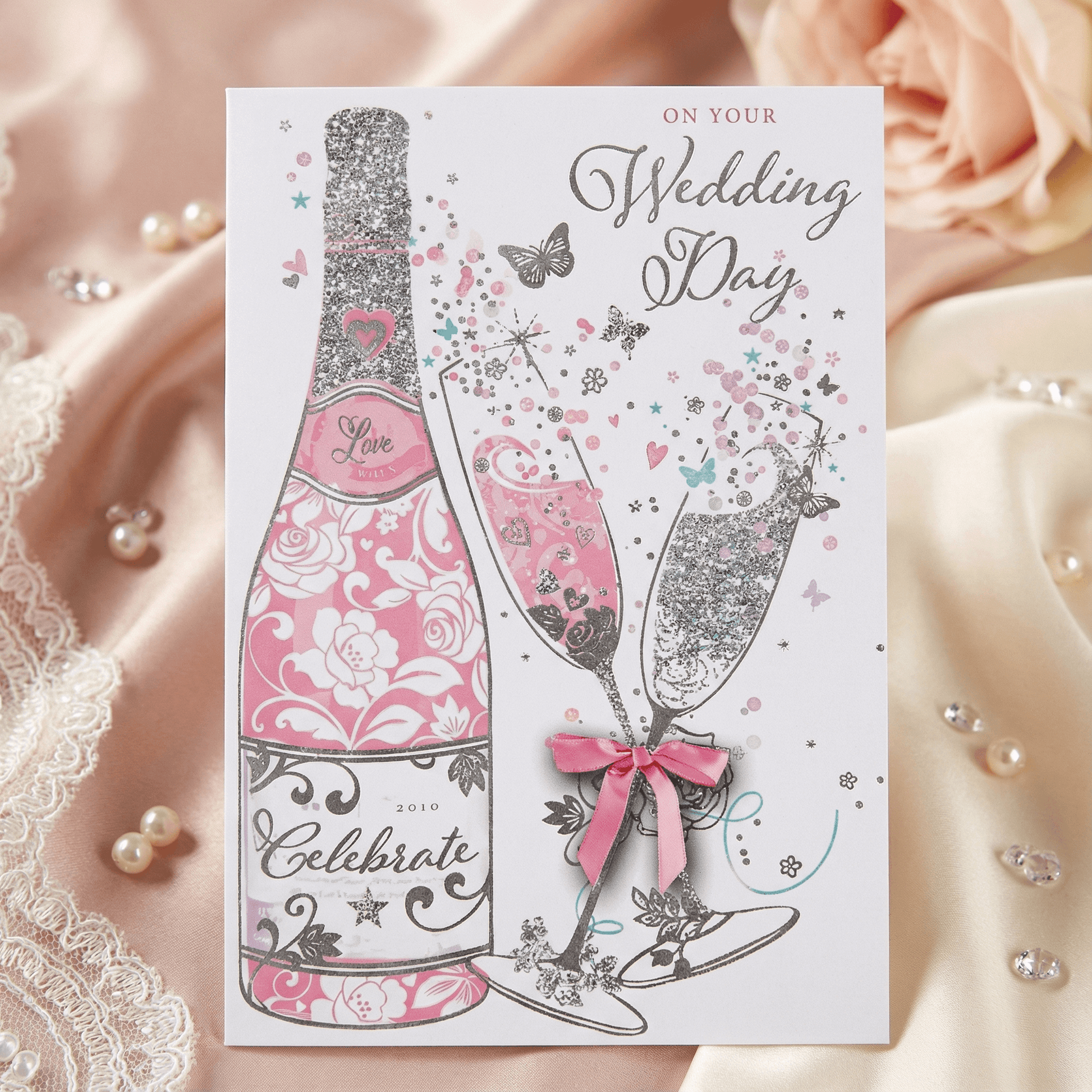 The design showcases a beautifully illustrated champagne bottle and two sparkling flutes—complete with glitter touches and a pretty pink bow—symbolising joy, celebration and the beginning of a beautiful journey together.