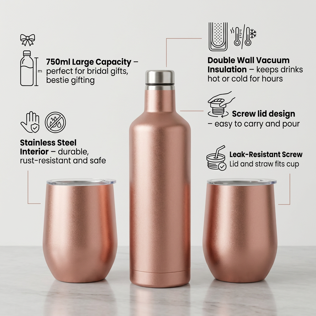 For those who love their drinks on the go, whether hot or chilled, this elegant set is the perfect hydration companion! With a sleek rose gold finish, it’s both stylish and durable—ideal for work, picnics, the gym, or even a beach day.