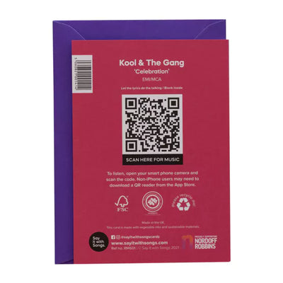This unique music card plays the classic song ‘Celebration’ by Cool and the gang. Scan the QR code on the reverse of the card with a smartphone camera and stream the song instantly from either Spotify, YouTube or Amazon Music. It’s the card they’ll keep forever.