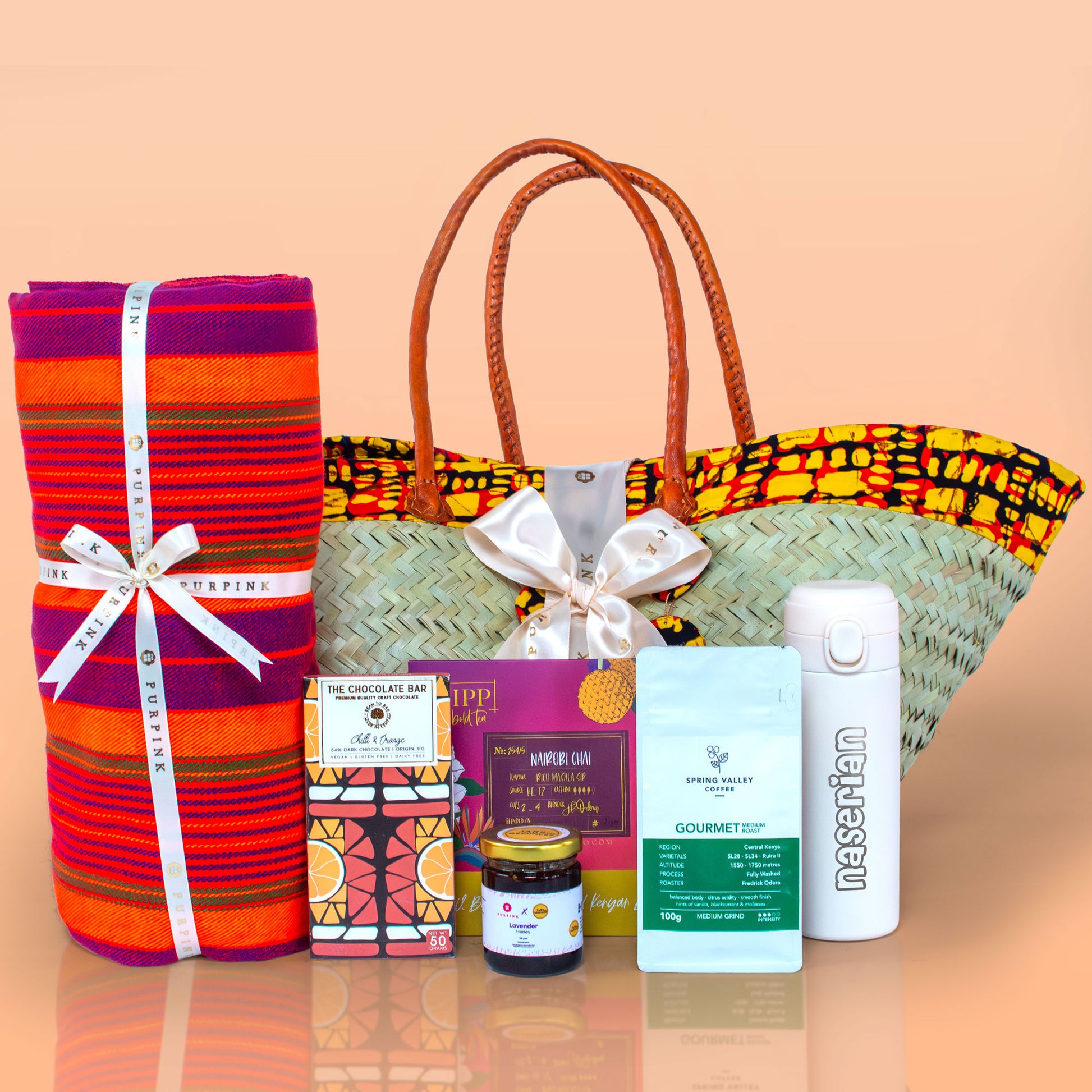 From bold Kenyan teas and freshly roasted coffee to decadent chilli-orange chocolate, each item captures the true essence of Kenya. Paired with stylish Ankara-lined baskets, a premium Maasai shuka, and a sleek thermal bottle, this hamper blends tradition with modern practicality. It’s a heartfelt, meaningful gift that celebrates the spirit and taste of Kenya.