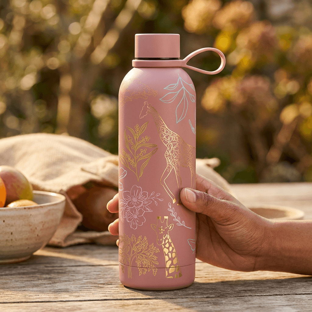 This beautifully illustrated insulated bottle features artwork by a young Kenyan female artist, making it more than just drinkware — it’s a celebration of creativity, culture, and conscious gifting. The striking terra Rose Color design adds personality and warmth, turning a daily essential into something truly special.
