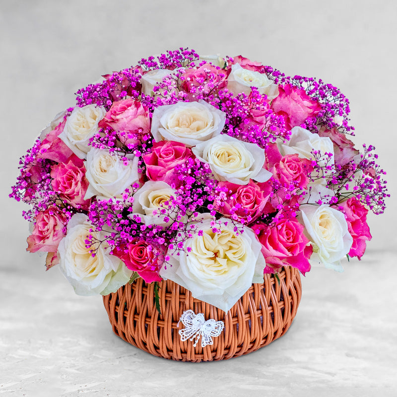 Express your deepest love and gratitude with The Heartfelt Handful flower basket. This exquisite arrangement is a personal, from-the-heart gift for the most important woman in your life - mom. Delicate white roses symbolise her pure, unconditional love and nurturing spirit. Paired with rich pink rose blooms that embody the passionate affection she showers her family with daily.