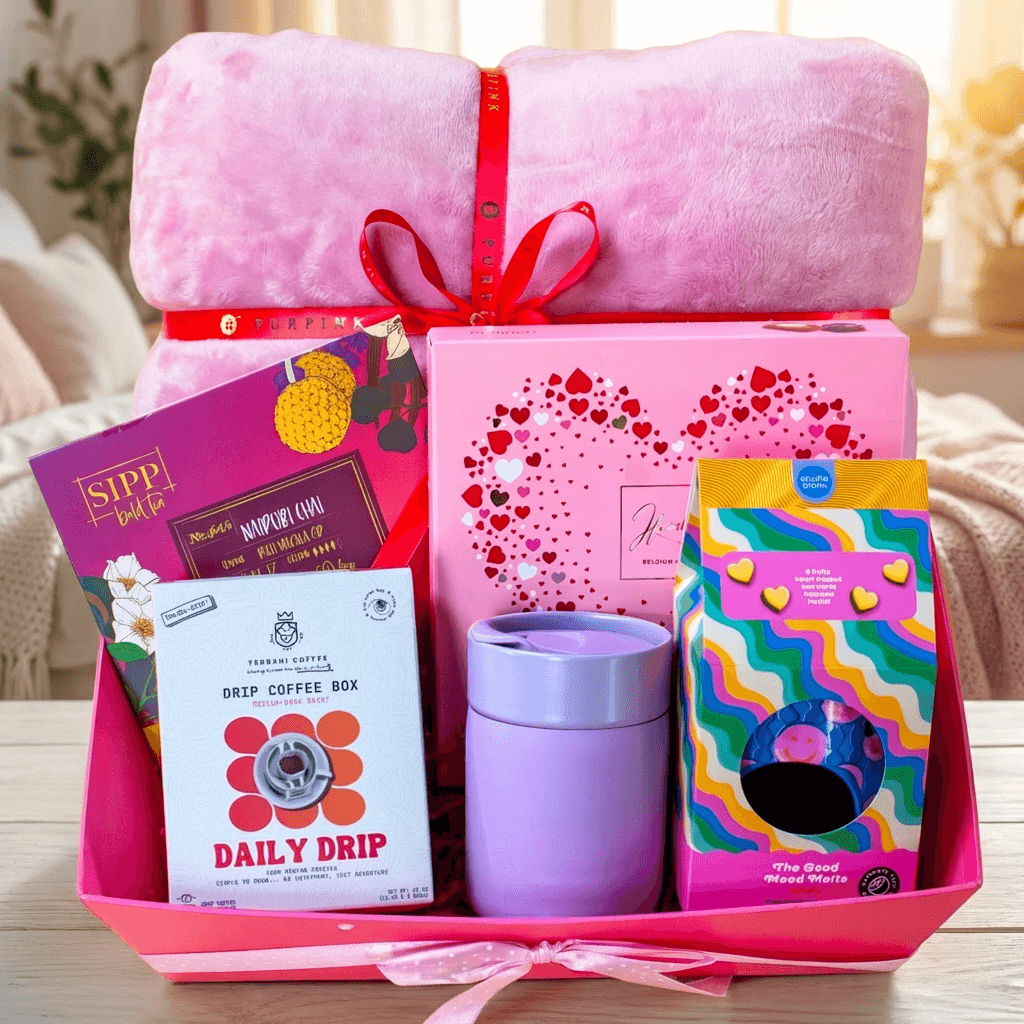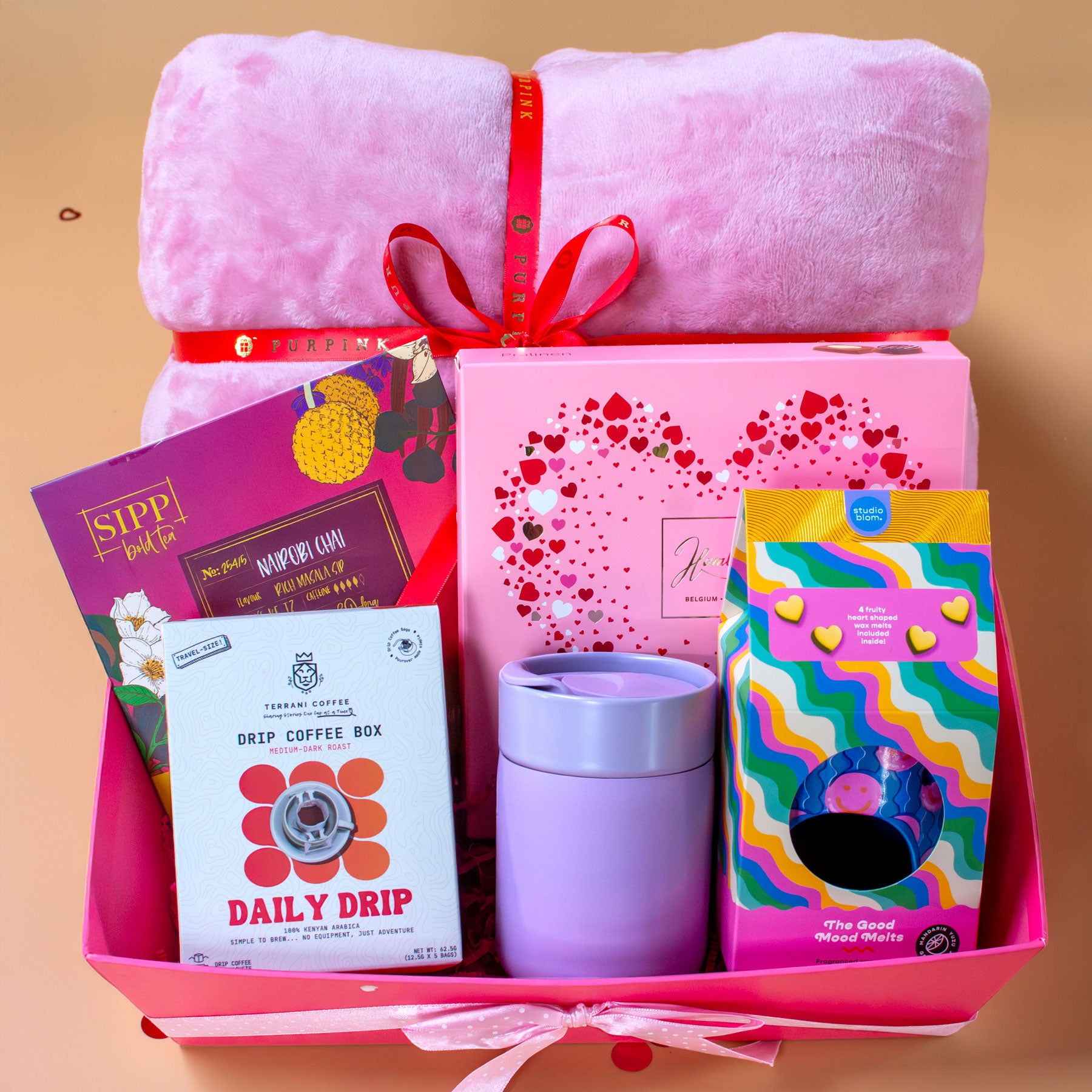 With a plush fleece blanket, warming tea and coffee, indulgent Belgian chocolates, and a soothing wax melt set, every element is chosen to create a sense of ease and well-being. Beautifully arranged on a pink tray and finished with ribbon, this hamper feels nurturing, heartfelt, and deeply comforting.