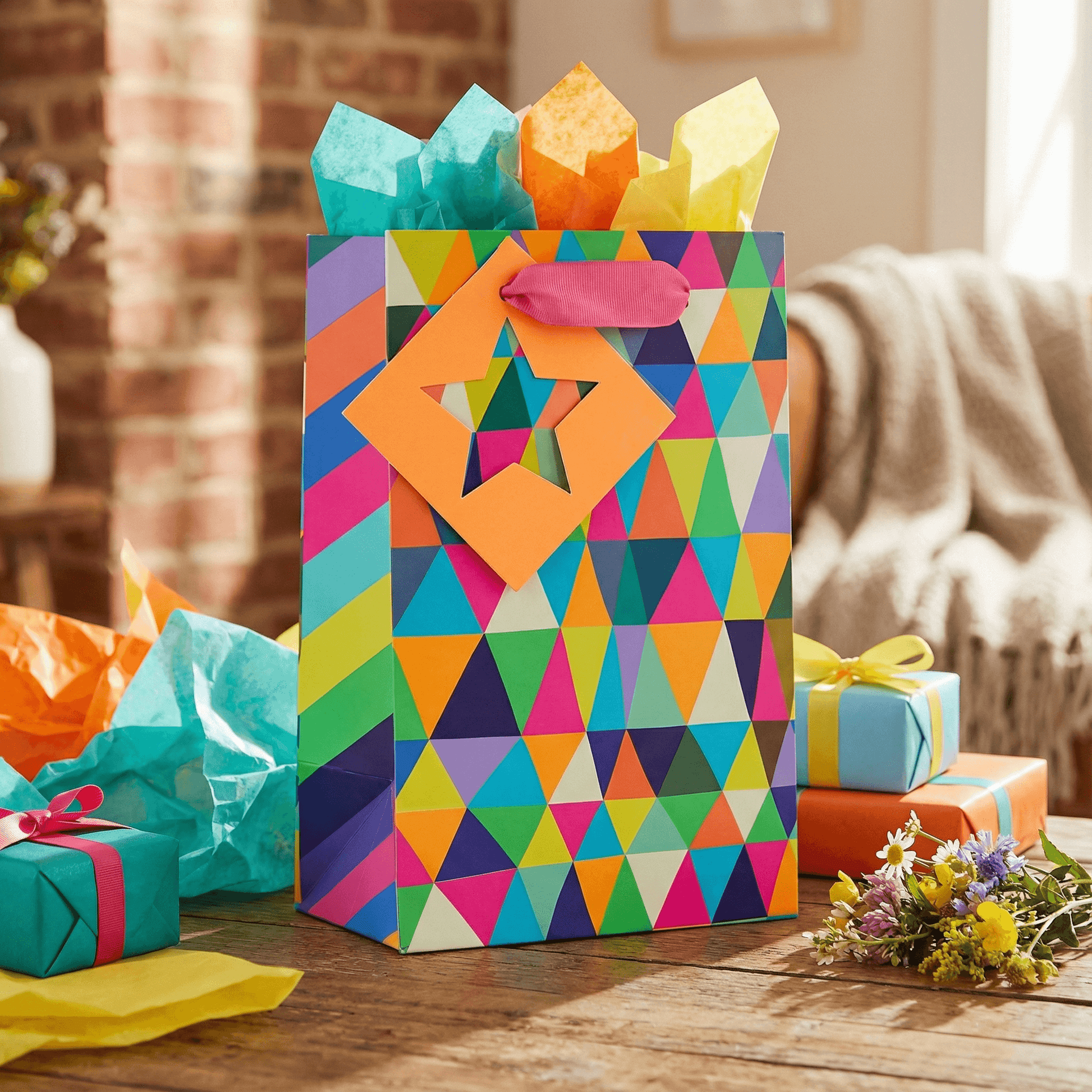 Make gifting brighter with our Triangles Gift Bag Collection, designed with a lively mosaic of multicoloured geometric triangles. This playful pattern adds instant excitement to your present, making it perfect for kids, teens, and anyone who loves vibrant, joyful designs.